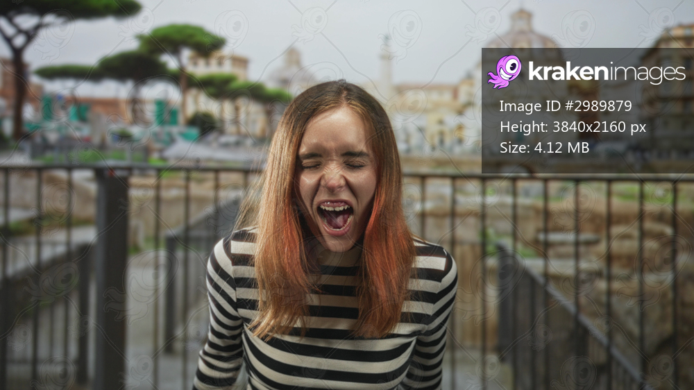 Young redhead woman with mouth open screaming, eyes closed, leaning on a railing at a historic building; playful surprise.