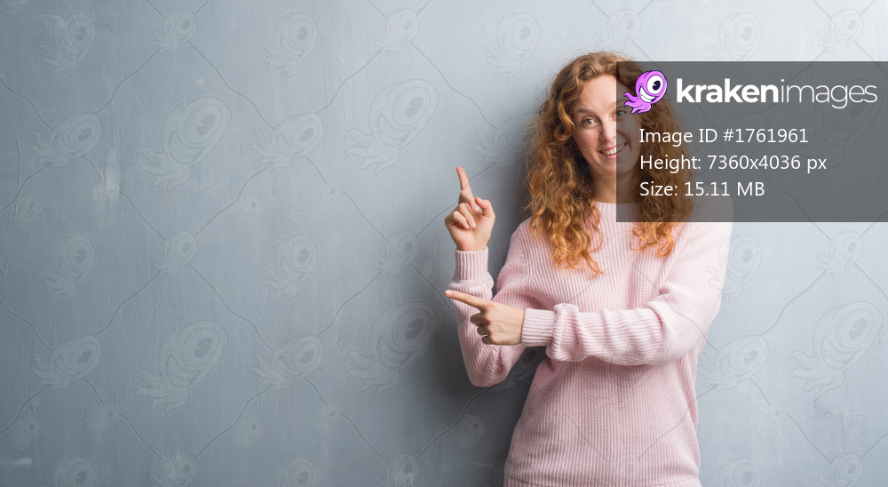 Young redhead woman over grey grunge wall wearing pink sweater smiling and looking at the camera pointing with two hands and fingers to the side.