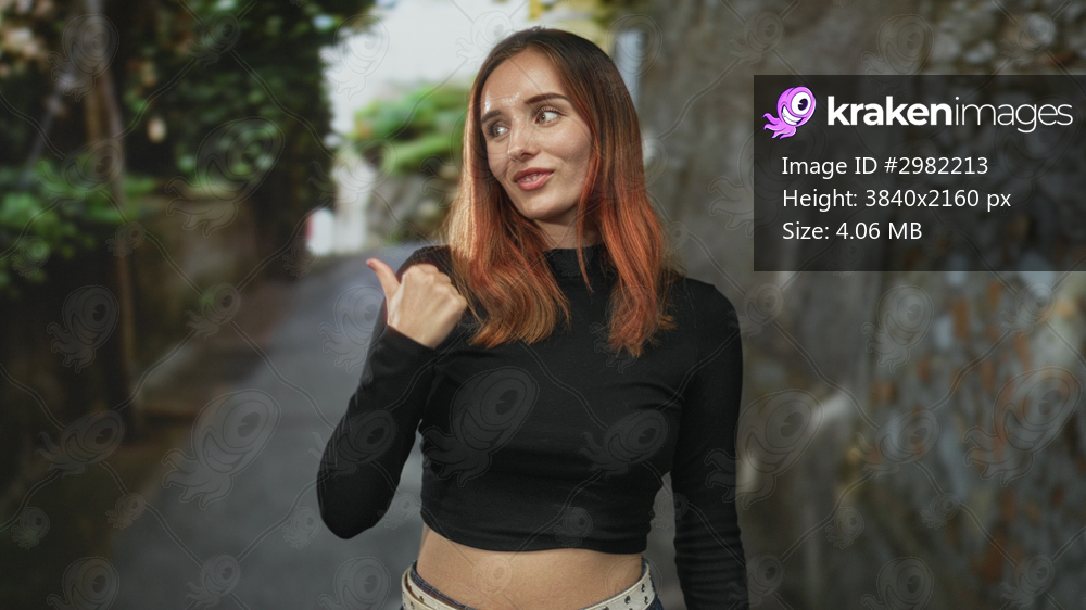 Young redhead woman pointing thumb to side showing exposed midriff on a narrow street; casual confidence.