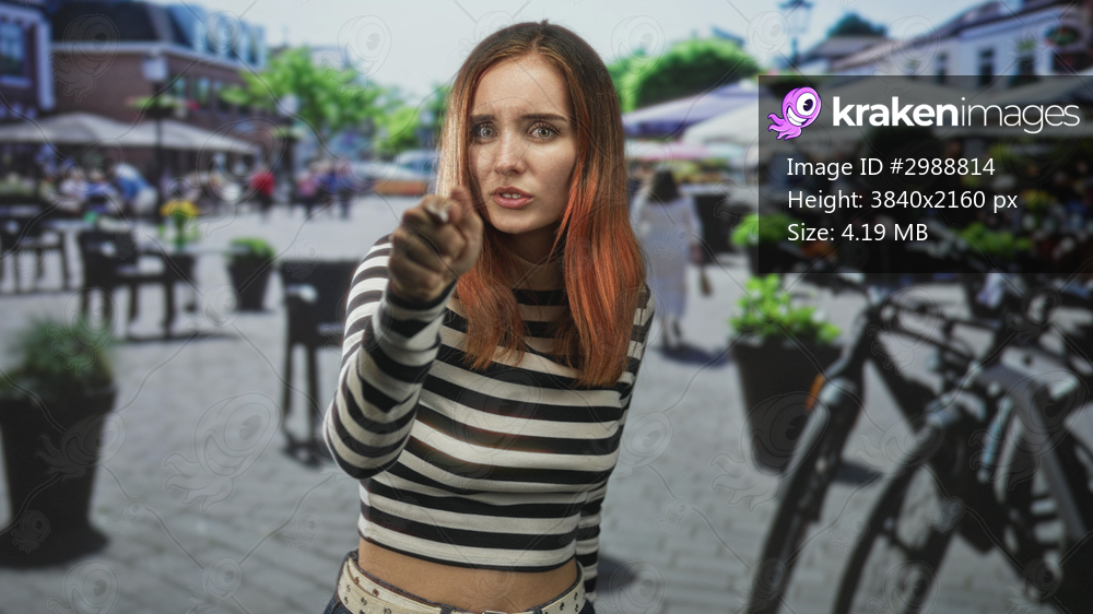 Young redhead woman points finger at camera on a busy pedestrian street with cafe umbrellas, bicycles, planters and striped crop top; accusation.