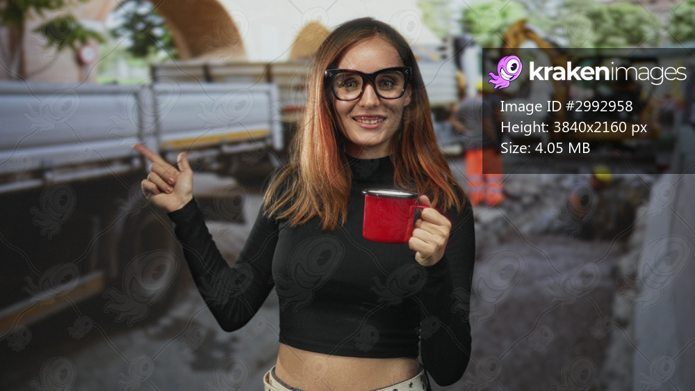 Young redhead woman points finger and holds red mug on a street with construction workers and truck; playful curiosity.