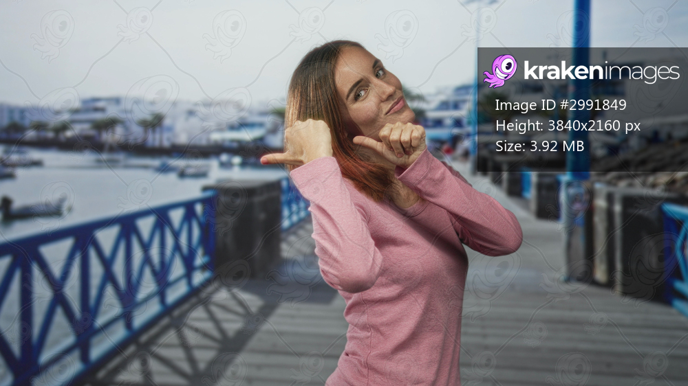 Young redhead woman points thumbs back near her face on a wooden street boardwalk, visible hands and smile; playful invitation.