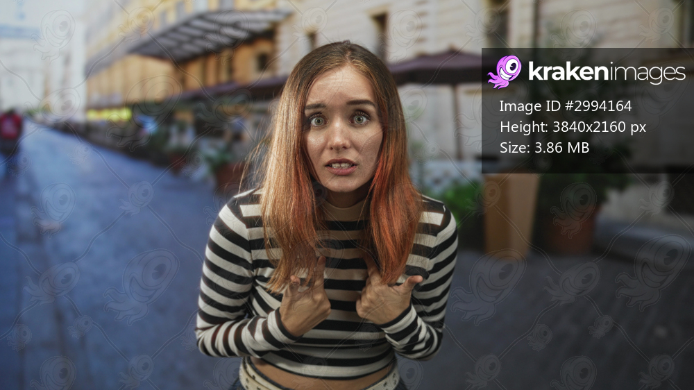 Young redhead woman points thumbs to chest on a cobblestone street outside cafes, wearing striped cropped top and belt; pleading vulnerability.