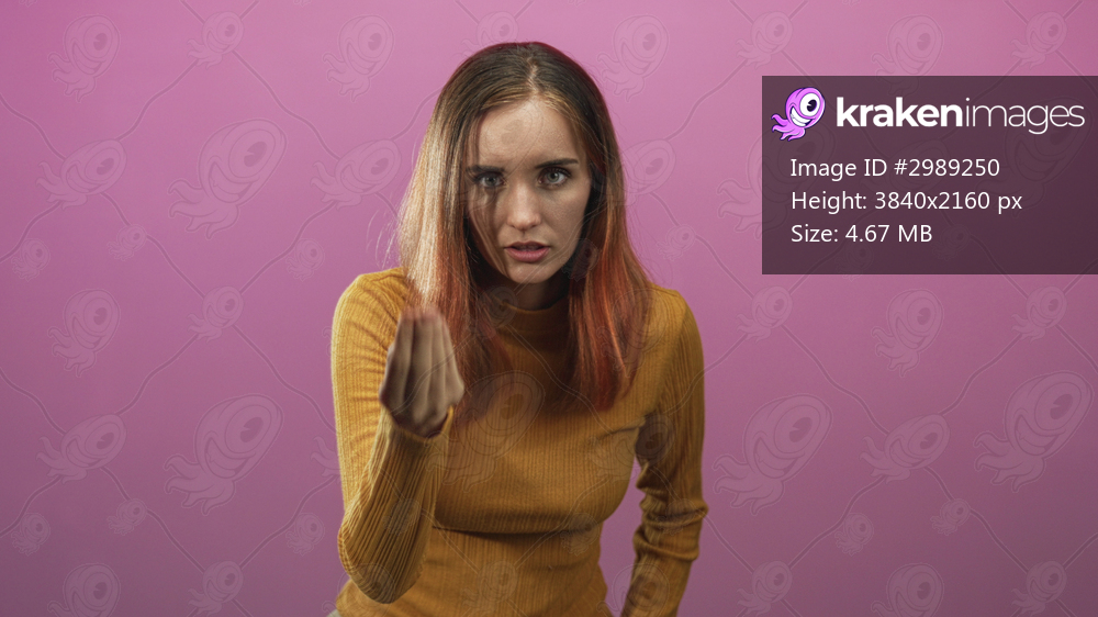 Young redhead woman showing pinched fingers gesture with right hand in studio with pink backdrop and mustard sweater; frustration demand insistence.