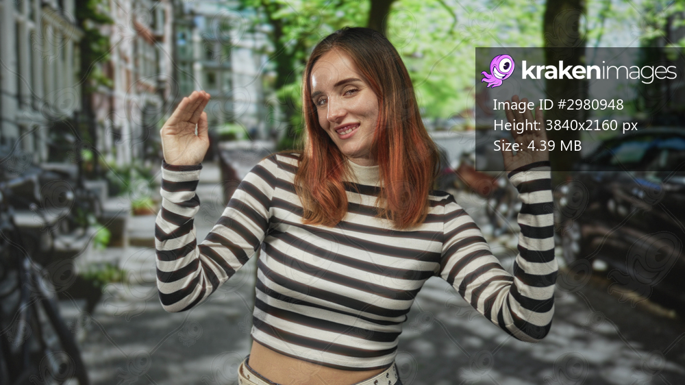 Young redhead woman smiling with raised hands and visible midriff in striped top on a leafy street; playful confidence.