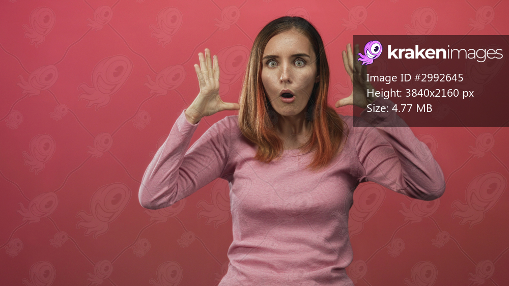 Young redhead woman with splayed hands and open mouth gesture in pink studio; surprise puzzlement uncertainty reaction.