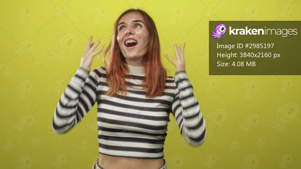 Young redhead woman with striped top, hands raised to head and open mouth in studio; excitement celebration.