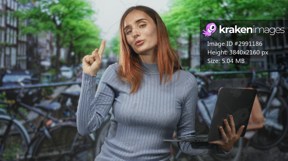 Young redhead woman waving hand and holding laptop on a street lined with bicycles and canal buildings; confidence remote work.