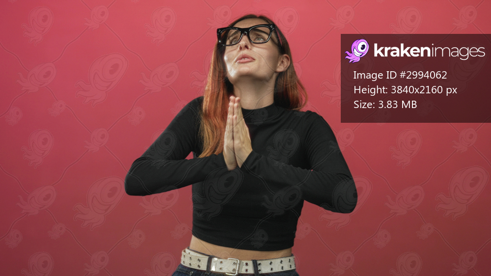 Young redhead woman wearing glasses and black crop top, hands together in prayer and looking upward with visible belt and midriff, studio; hopeful plea. - Kraken Images