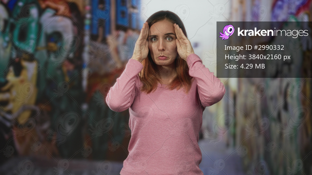 Young redheaded woman covers eyes with both hands on graffiti lined urban street, wearing a pink sweater and standing centered; anxiety solitude.