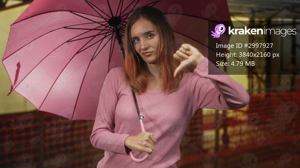 Young redheaded woman holding a pink umbrella and giving thumbs down gesture in a building; disapproval.