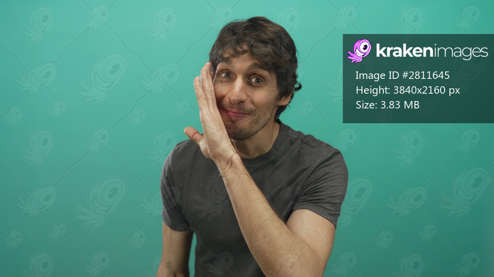 Young scruffy man cupping hand to mouth whispering in gray t shirt in studio against teal backdrop; secrecy.