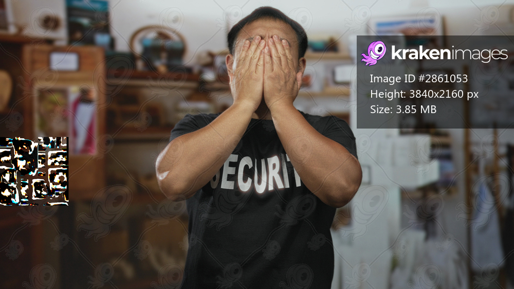 Young security man wearing a black shirt touches his forehead with closed eyes inside a building corridor; fatigue.
