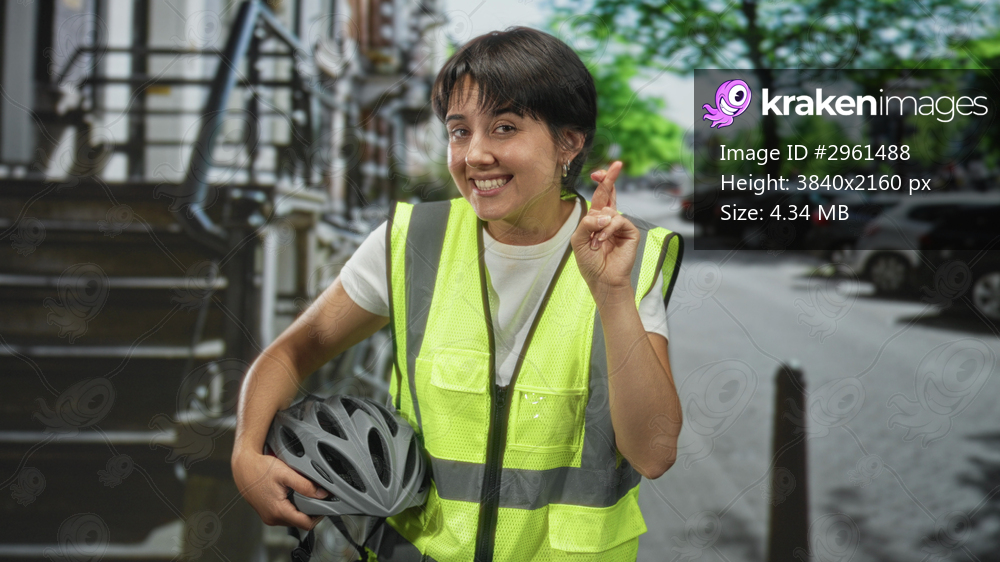 Young short hair woman wearing a neon safety vest holding a bicycle helmet and crossing fingers on a city street; hope safety.