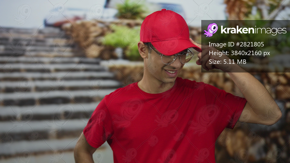 Young smiling hispanic delivery man wearing glasses points finger to red cap at building; confidence pride.