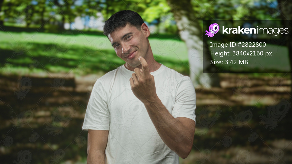 Young smiling hispanic man beckoning with finger in lush forest park clearing under bright sunlight; invitation.