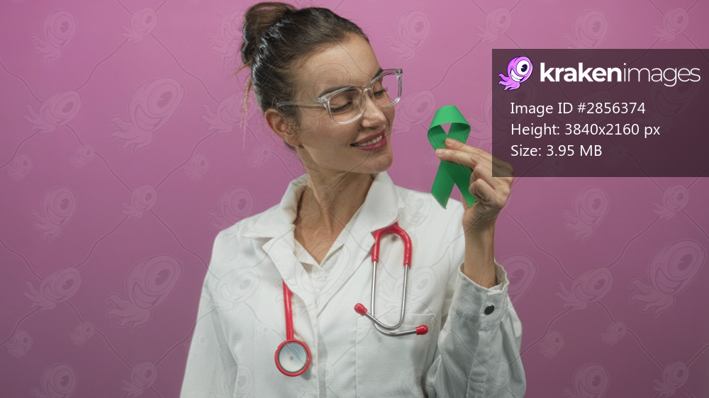 Young smiling hispanic woman doctor holding green ribbon in pink studio; mental health awareness hope.