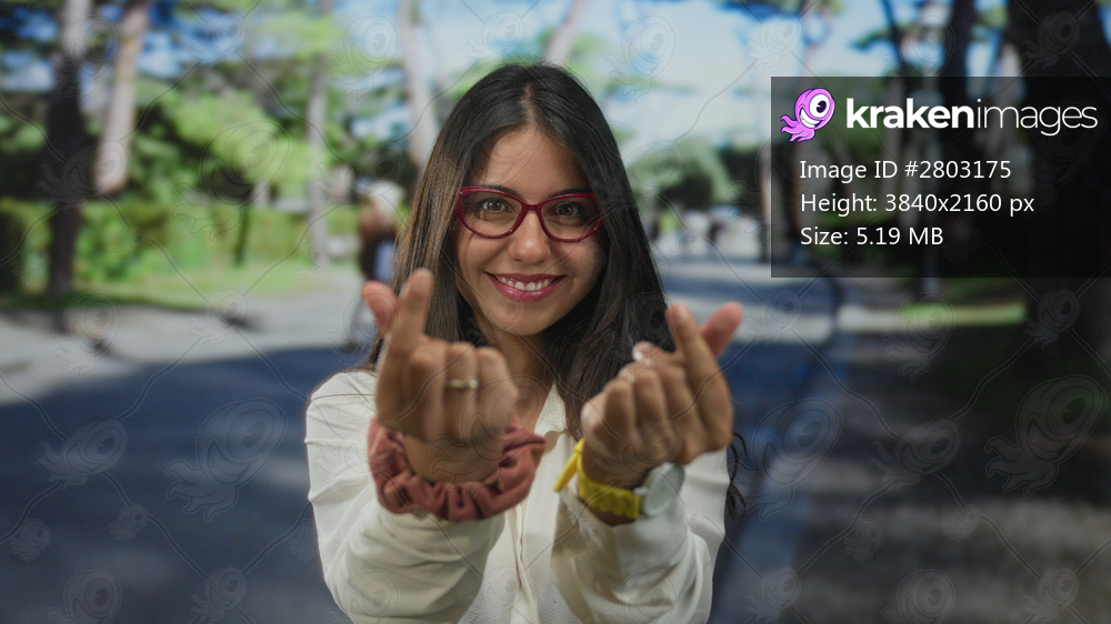 Young smiling hispanic woman making heart gesture with fingers on sunny tree lined street; love affection.