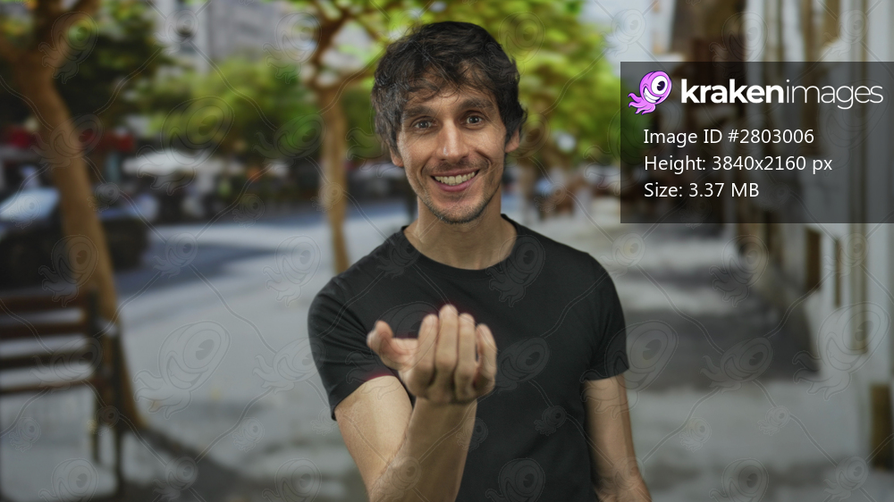 Young smiling man in casual black t shirt blows kiss with hand toward camera on lively city street; affection warmth greeting romance.