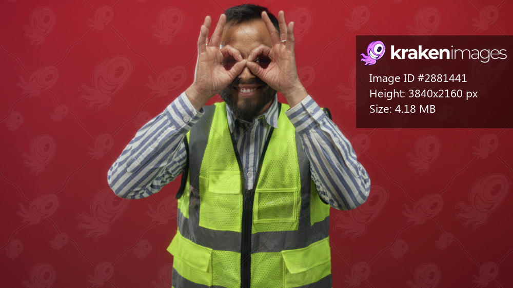 Young smiling man in high visibility vest making hand binoculars gesture in red studio; playful curiosity.