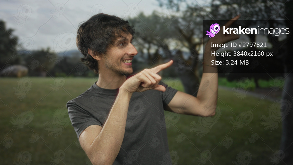 Young smiling man wearing gray tshirt finger pointing to tree in green forest; curiosity exploration discovery.