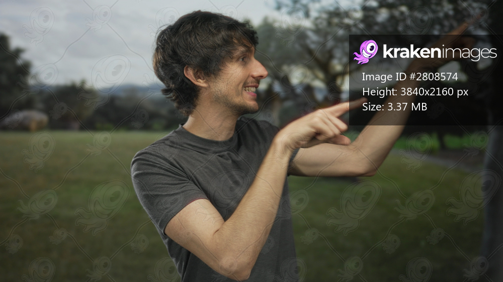 Young smiling man wearing gray tshirt finger pointing to tree in green forest; curiosity exploration discovery.