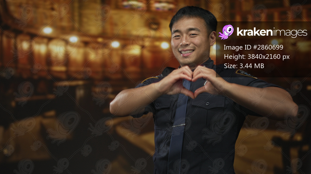 Young smiling uniformed policeman forming a heart with hands inside ornate catholic church building; compassion.