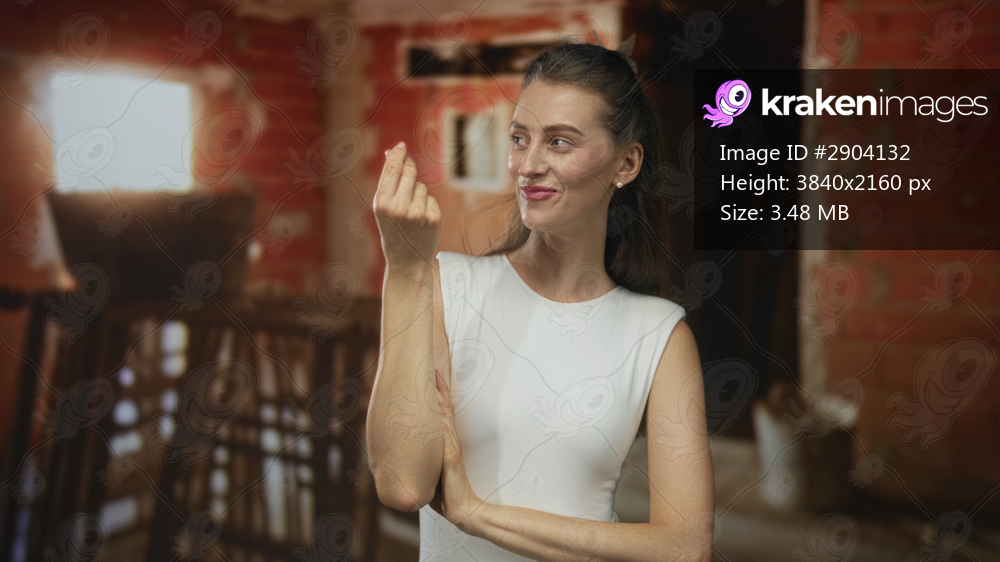 Young smiling woman with exposed forearm showing pinched fingers gesture in building; confidence invitation.