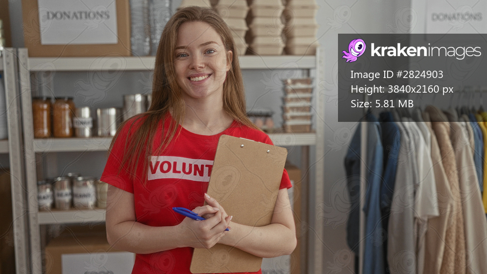 Young smiling woman holding clipboard in building donation center; teamwork compassion community support.
