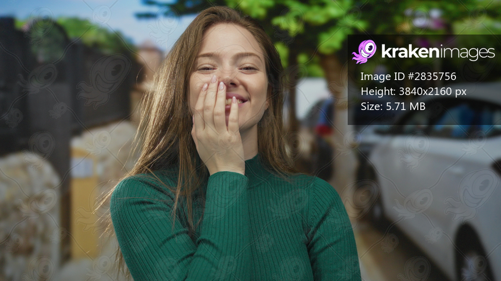 Young smiling woman in a green sweater covers half her face with her hand on a sunlit urban street; shyness.