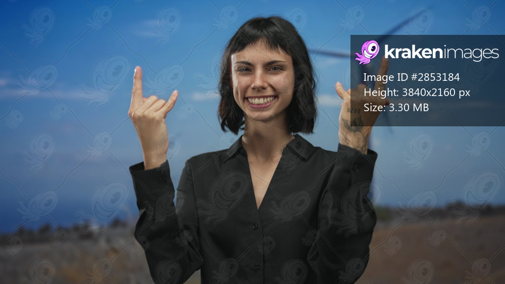 Young smiling woman makes rock horns gesture in front of a windmill building in a sunny field; excitement.