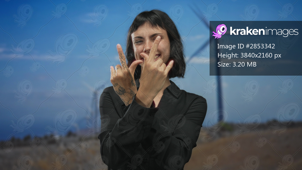 Young smiling woman makes rock horns gesture in front of a windmill building in a sunny field; excitement.