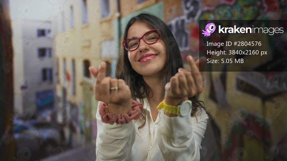 Young smiling woman making finger heart gesture on vibrant graffiti street outdoors; affection friendship.