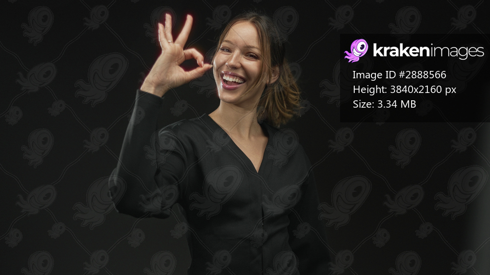Young smiling woman making ok sign with raised hand and visible teeth wearing black blouse in black studio lit by soft light; joy optimism.