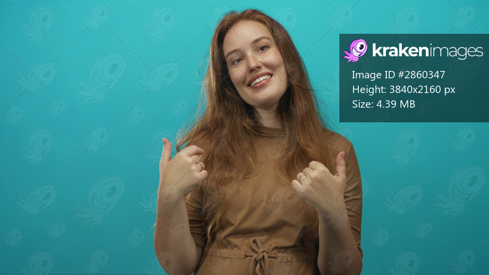 Young smiling woman offering open palms gesture in a bright turquoise studio scene; warm friendly welcome.