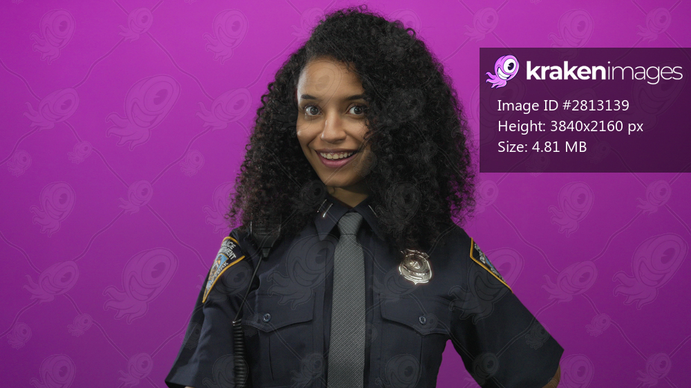 Young smiling woman police officer points finger upward against an isolated pink studio wall; pride duty.