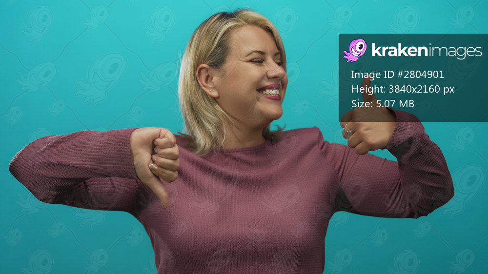 Young smiling woman shows dual bright thumbsup and thumbsdown gesture in turquoise studio; indecision.