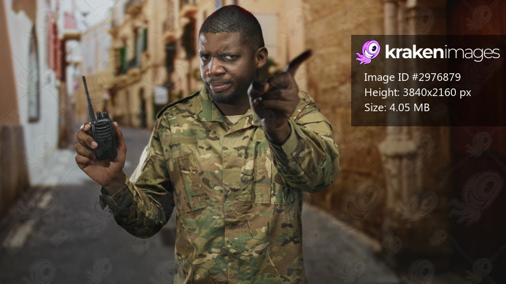 Young soldier in camouflage holding a radio, finger to lips for silence in a narrow stone street alley during urban patrol; caution vigilance duty.