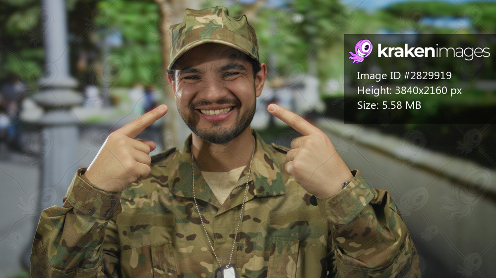 Young soldier man smiles broadly while pointing finger to cheek beside green trees in park; pride duty.