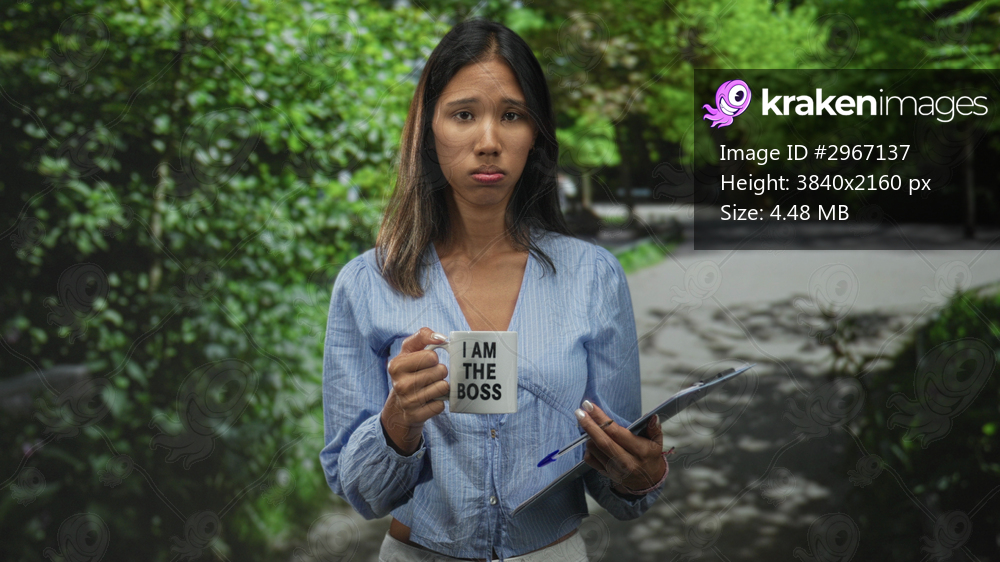 Young southeast asian woman holding a mug and clipboard on a forest path, mug reads i am the boss; subtle resignation.
