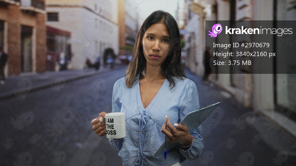 Young southeast asian woman holding a mug reading i am the boss and clutching a clipboard on a cobbled street; confidence.