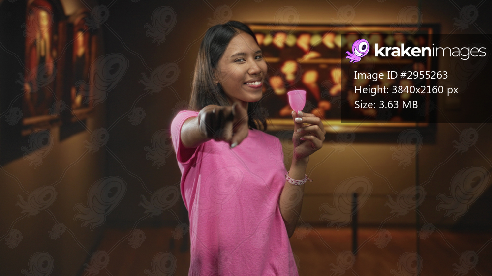 Young southeast asian woman holds a pink menstrual cup with one hand and points index finger toward camera while smiling in a museum building; empowerment menstrual health. - Kraken Images