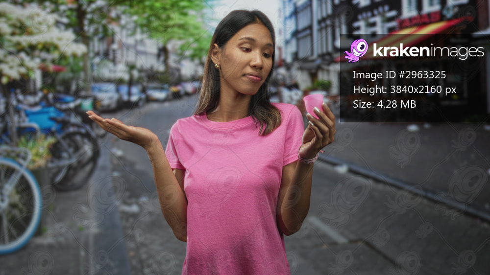 Young southeast asian woman holds pink menstrual cup in one hand and shrugs left hand on a city street with bicycles and cafe; uncertainty.