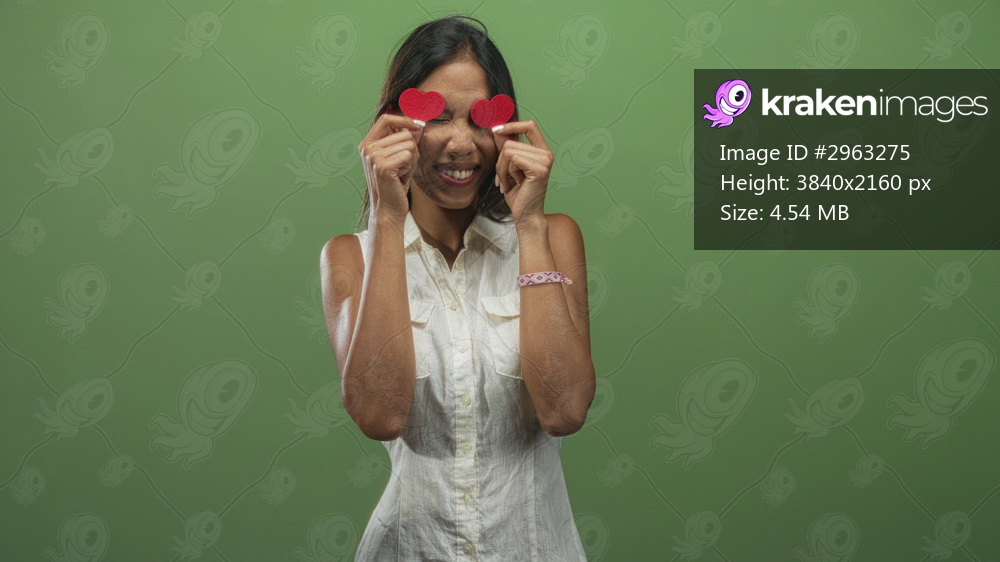 Young southeast asian woman holds red paper heart cutouts over her eyes with both hands, smiling in a green studio while wearing a white sleeveless top and bracelet; playful joy. - Kraken Images