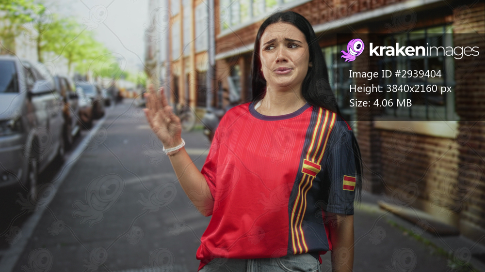Young spanish woman wearing a red spain soccer jersey grimaces with teary face on a city street beside a brick building and parked cars; disappointment. - Kraken Images