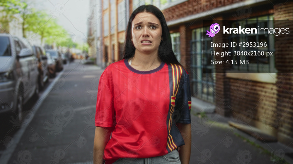 Young spanish woman wearing a red spain soccer jersey grimaces with teary face on a city street beside a brick building and parked cars; disappointment. - Kraken Images
