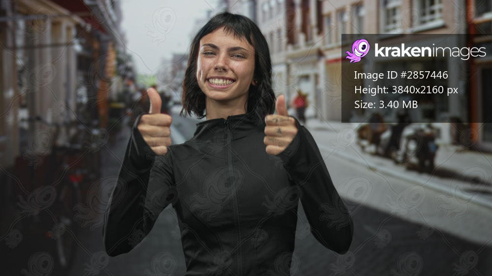 Young sporty woman smiling and giving thumbs up in black athletic jacket on city street; confidence.
