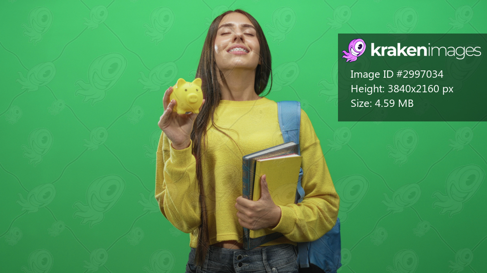 Young student woman holding yellow piggy bank and clutching notebooks, eyes closed and smiling in studio; future savings confidence.