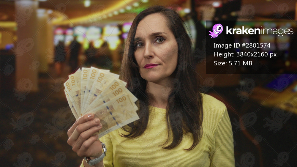 Young swedish woman holds fanned krona banknotes in hand while pointing finger to the money near slot machines in a casino; caution risk.