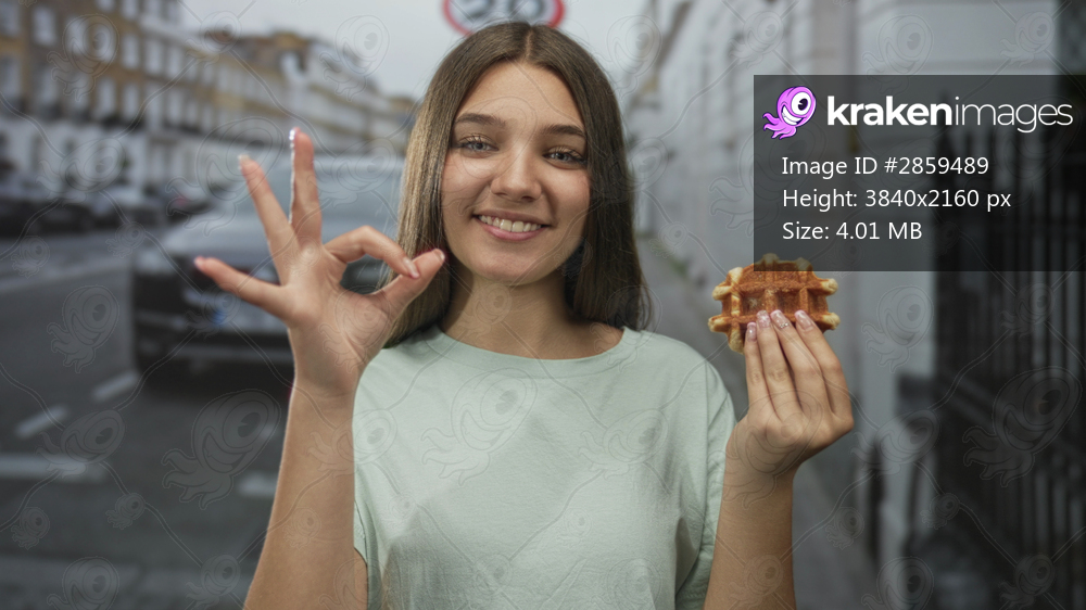 Young teenage girl smiling holds waffle and makes ok hand gesture on a sunlit busy city street; approval.